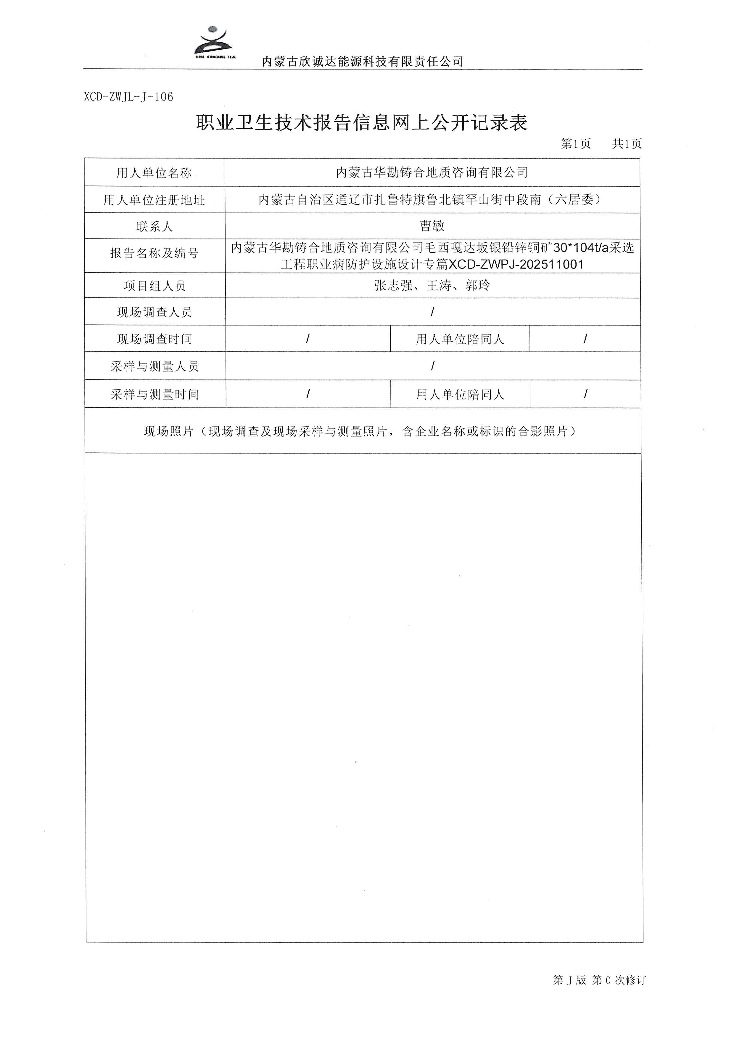 内蒙古华勘铸合地质咨询有限公司毛西嘎达坂银铅锌铜矿30*104t/a采选工程职业病防护设施设计专篇XCD-ZWPJ-202511001