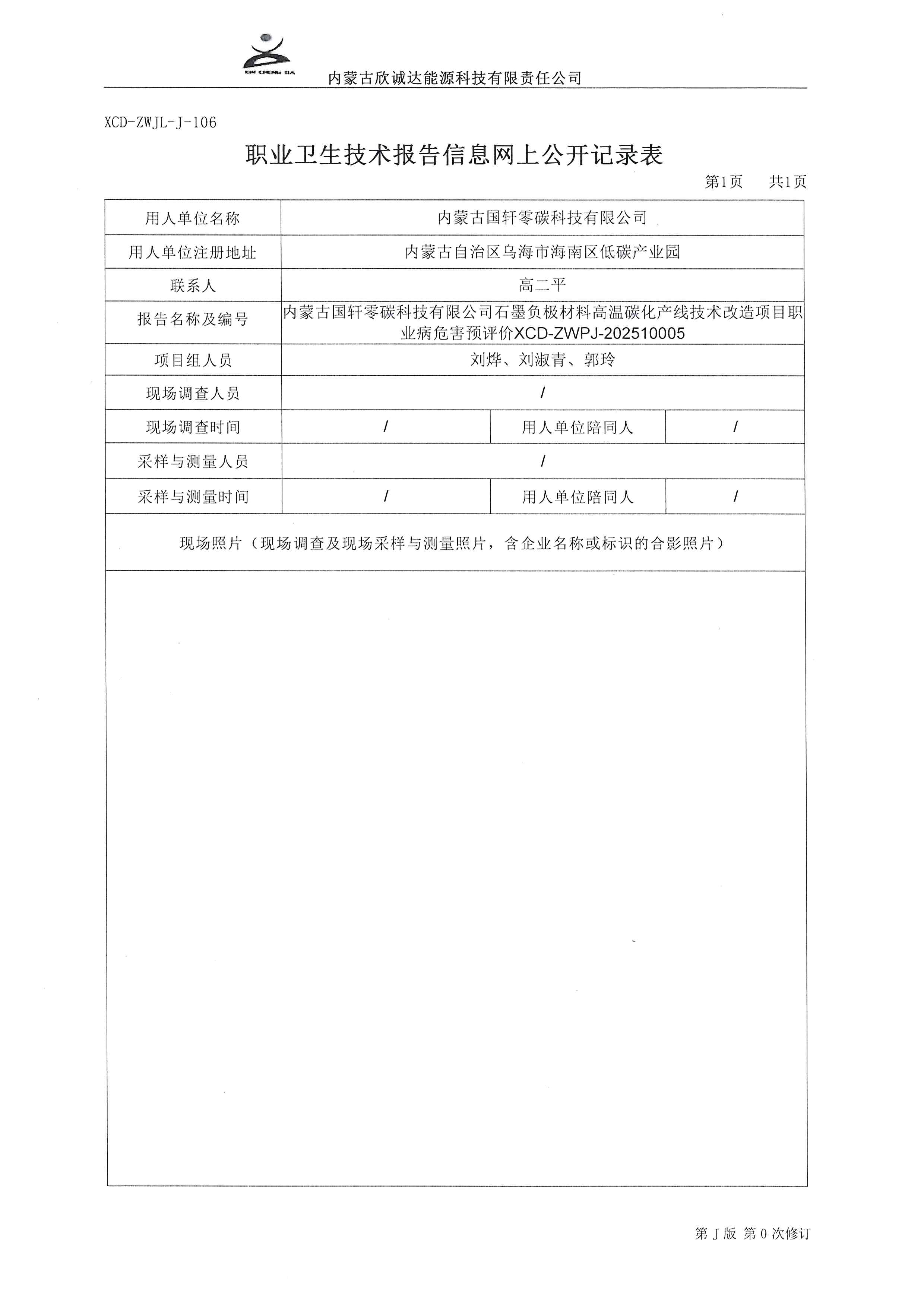 内蒙古国轩零碳科技有限公司石墨负极材料高温碳化产线技术改造项目职业病危害预评价XCD-ZWPJ-202510005