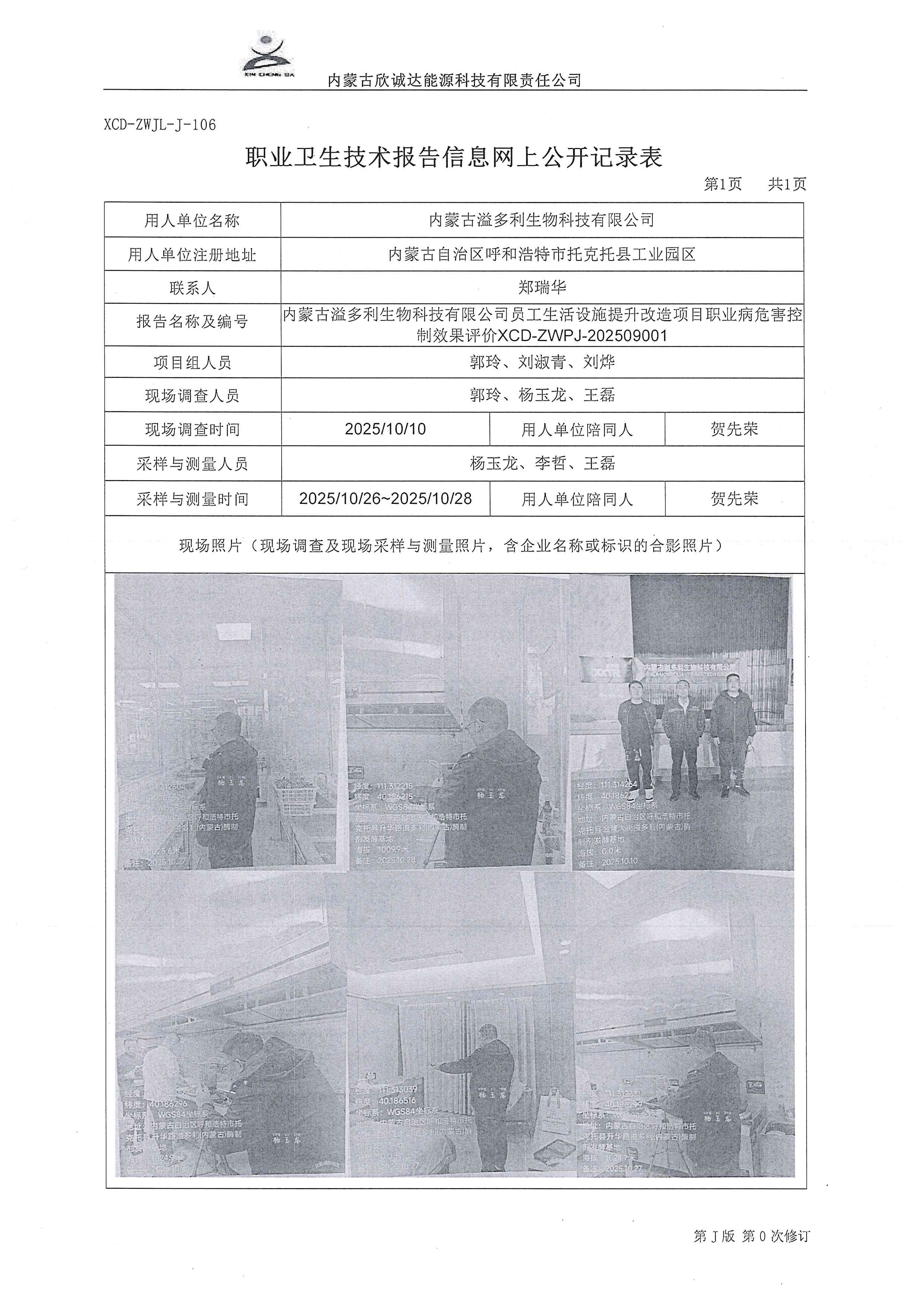 内蒙古溢多利生物科技有限公司员工生活设施提升改造项目职业病危害控制效果评价XCD-ZWPJ-202509001