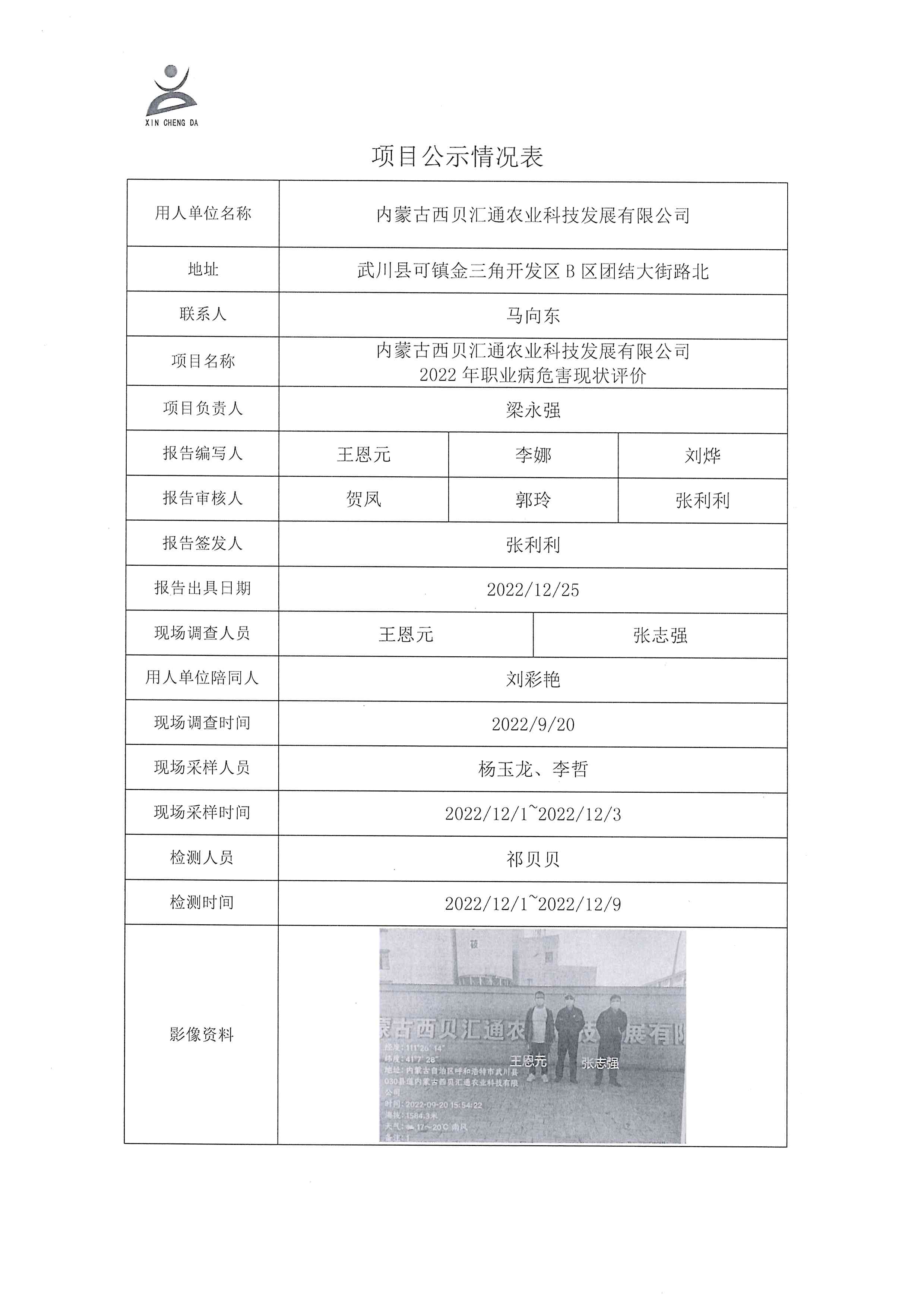 内蒙古西贝汇通农业科技发展有限公司2022年职业病危害现状评价