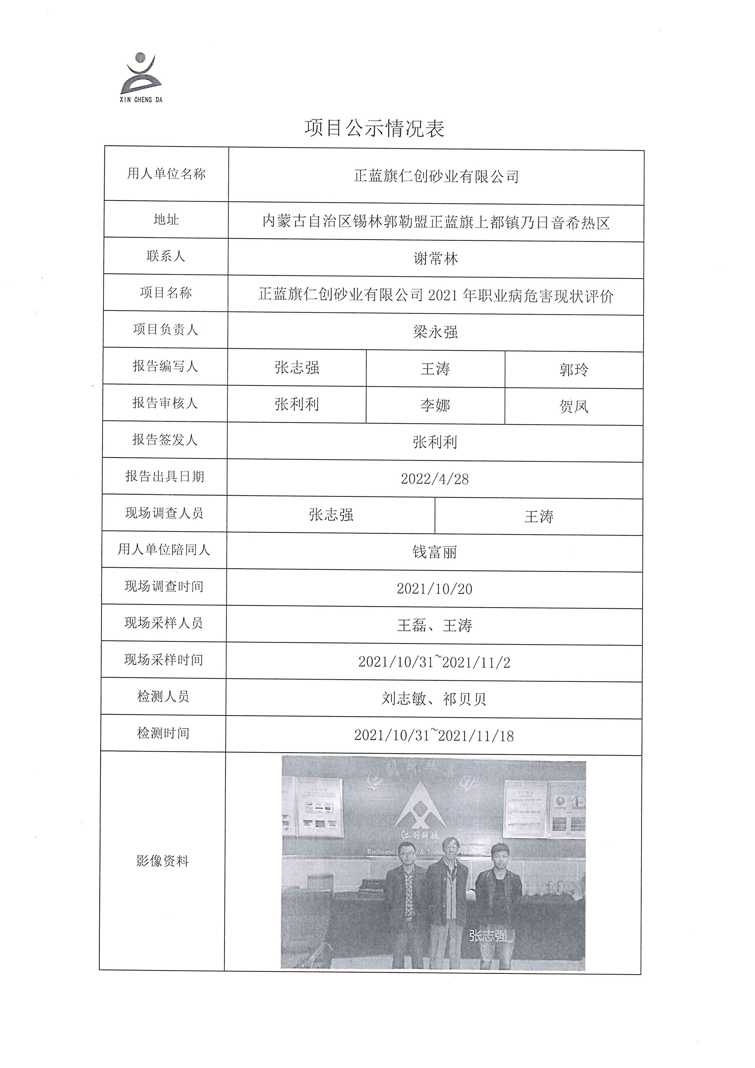 正蓝旗仁创砂业有限公司2021年职业病危害现状评价